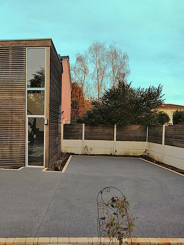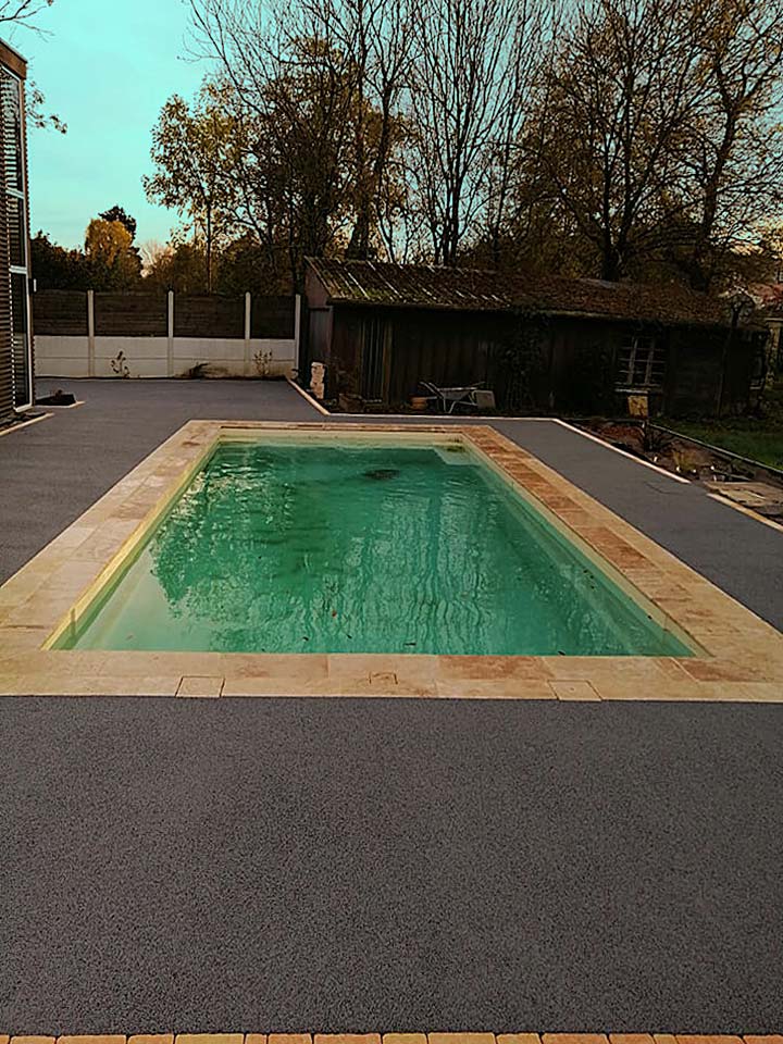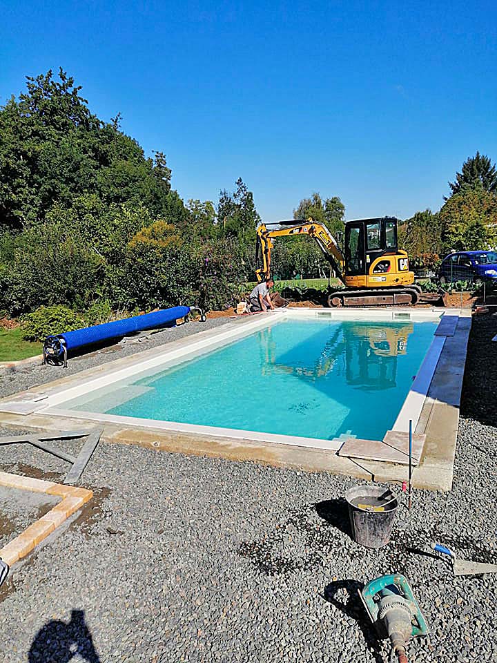 Aux beaux jours, il sera très agréable de rêver, allongé sur un transat sur la plage de piscine en béton poreux, de prendre l’apéritif sur la terrasse agréablement délimitée par des pavés, ou de plonger en prenant appui sur les margelles (Travertin), et de se rafraîchir dans la piscine, ressortir et se sécher avant de descendre l’escalier en ardoise qui conduit au jardin…
