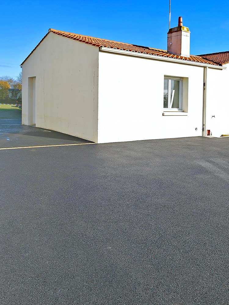 Le choix de l’enrobé noir 0/6, lisse et robuste, assure une longévité exceptionnelle tout en apportant une touche de modernité sobre. Sa couleur profonde crée un contraste élégant avec les façades claires de la maison, tout en unifiant l’ensemble par sa simplicité. L’enrobé, facile d’entretien et résistant, est idéal pour supporter le passage des véhicules et des piétons, sans perdre de son éclat au fil des saisons.
